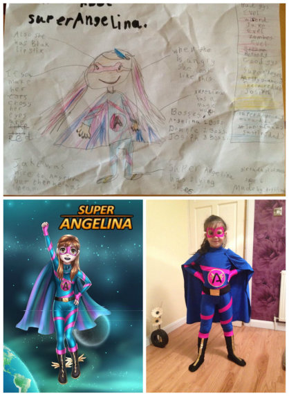 One day my daughter came home from school and told me she had decided to become a superhero. She showed me her drawing, I sent it to be drawn in manga style then I had the costume made. Watch out villains, Super Angelina is about!!!